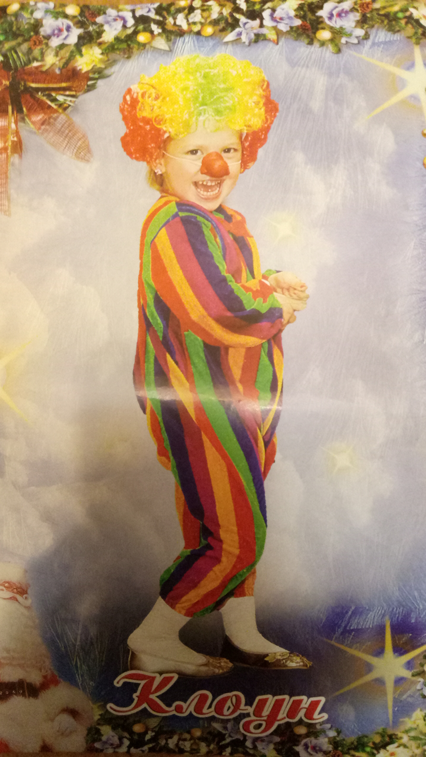 Состоит из комбеза, парика, носика и бабочки.