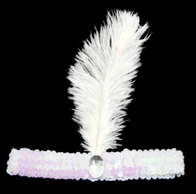 Повязка Чикаго белая — красивая повязка с большим и пушистым пером, перенесет Вас во времена гангстерского Чикаго и подчеркнет Ваш образ на любой вечеринке!